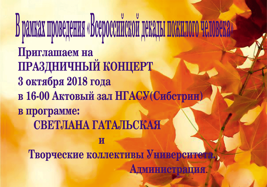 3 октября 2018 года (среда) в рамках проведения Всероссийской декады пожилого человека в НГАСУ (Сибстрин) пройдет праздничный концерт. В программе мероприятия выступят творческие коллективы университета и музыкальный руководитель Дома творчества «Октябрьский» Светлана Борисовна Гатальская.
