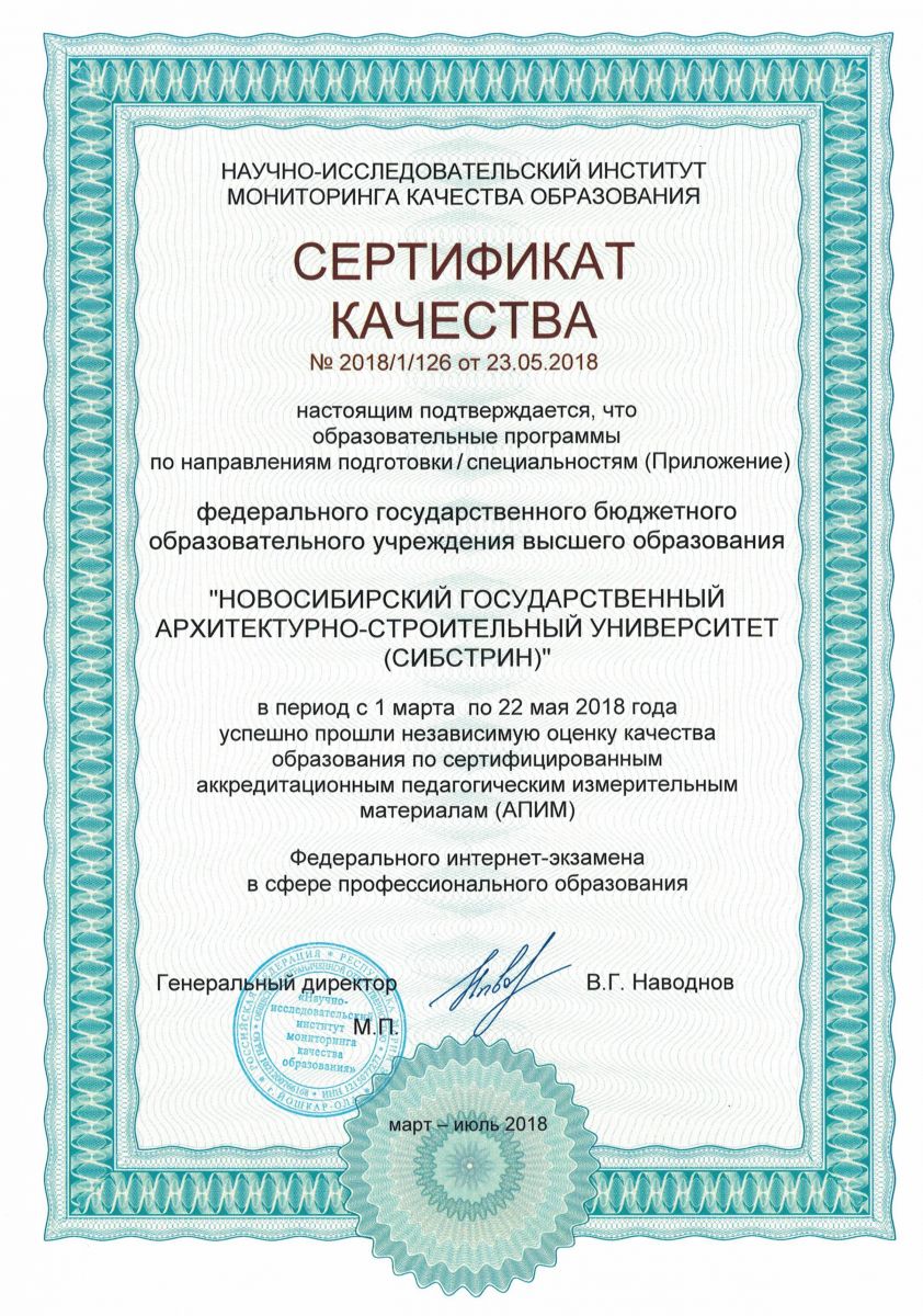 Новосибирским государственным архитектурно-строительным университетом (Сибстрин) получен сертификат качества, подтверждающий, что в период с 1 марта по 22 мая 2018 года образовательные программы, реализуемые в университете, успешно прошли независимую оценку качества образования