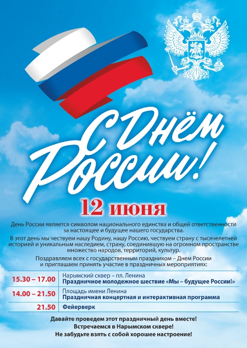 12 июня в рамках празднования Дня России в 16.30 от Нарымского сквера стартует молодежное шествие «Мы – будущее России». Планируется, что в колонне до площади Ленина пройдут около 10 тыс. молодых людей из всех районов Новосибирской области.