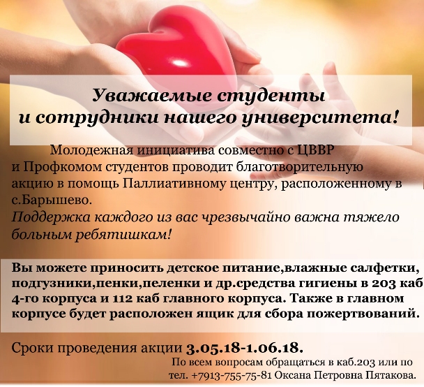 С 3 мая по 1 июня 2018 года Молодежная инициатива ЦВВР совместно с Профкомом студентов НГАСУ (Сибстрин) проводит благотворительную акцию в помощь детскому паллиативному центру, расположенному в селе Барышево.
