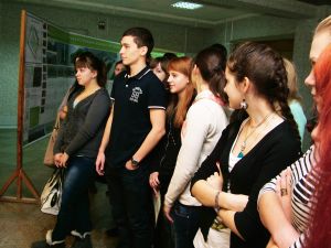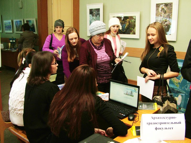 В течение всего дня в холле актового зала работали стенды факультетов, где школьники и их родители могли получить подробную информацию по поступлению в наш вуз и задать все интересующие вопросы. Факультеты представили очень интересную выставку – факультет инженерных и информационных технологий продемонстрировал опыты на определение химического состава строительных материалов, инженерно-экологический факультет представил богатую коллекцию виде-роликов и презентаций о жизни факультета, строительный факультет, архитектурно-градостроительный факультет, факультет экономики, менеджмента и гуманитарного образования представили школьникам хороший раздаточный материал, показали лучшие квалификационные работы, яркие презентации.