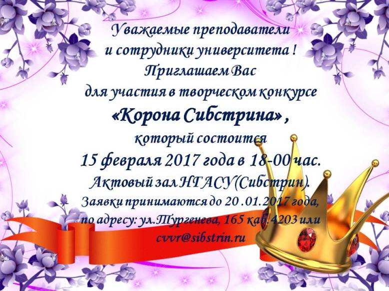 15 февраля 2017 года в НГАСУ (Сибстрин) впервые пройдет конкурс «Корону Сибстрина». Принять в нем участие могут все желающие из числа преподавателей и сотрудников университета. Для этого необходимо подать заявку до 20 января.