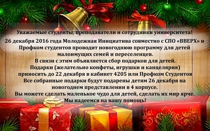 Подарки (желательно конфеты, игрушки и канцелярию) можно приносить до 22 декабря в кабинет 4205 (4-й учебный корпус) или Профком студентов (ком. 112 главного корпуса).