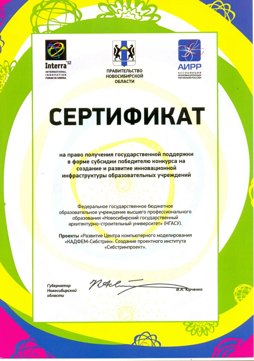 В завершение форума 15 сентября 2012 года состоялось торжественное вручение Губернатором Новосибирской области В.А. Юрченко сертификатов на право получения государственной поддержки в форме субсидий победителям конкурса среди высших учебных заведений на организацию и развитие научной и инновационной инфраструктуры в образовательной среде. Наш университет вошел в число победителей конкурса, наряду с НГТУ, СГГА и НГАХА.