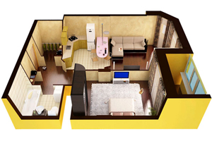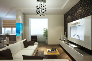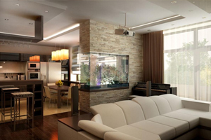 Комната отдыха или гостиная - одна из основных комнат в любой квартире. В ней обычно проводят время все члены семьи, тут принимают гостей, работают, отдыхают. Соответственно функционал гостиной должен быть разнообразен. Интересен вариант, когда гостиная совмещается с кухней, создавая отдельно кухонную зону и зону отдыха. Такой подход позволяет унифицировать помещения, сделать их более удобными для жильцов. Зонирование гостиной может проводится с помощью разного освещения, многоуровневых полов и потолка, цветовых решений, мебели и т.д