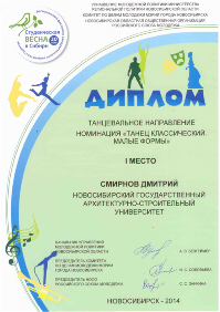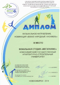 В номинации «Народный танец. Соло» первое место было присуждено студенту нашего вуза Дмитрию Смирнову за танец «Гопак». 2 место в номинации «Народный танец» занял коллектив «Сибирь», а 3 место – вокальная студия «Мегаполис» в номинации «Народный вокал. Ансамбли». Кроме того, специальным призом фестиваля в номинации «Народный вокал. Дуэт» отмечены Валентина Неустроева и Сюзанна Седалищева, покорившие зрителей уникальностью исполнения.